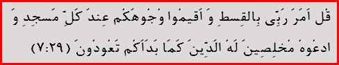 This Ayat says, when there is a call for Friday prayer, rush for the "Dhikr of ALLAH." This word "Dhikr" means reciting the name of Allah. In this ayat Allah dose not say, "Tadhkir" meaning "giving advice" to educate or to admonish, it only says, to remember Allah, and nothing ells. As Allah informed us in section (30) above, that No one should explain the Ghor-on to us. No one should fabricate any saying and attribute it to Allah. No one should teach us the Arabic Ghor-on except Allah, the Gracious. Yet, we came up with a "khutbah sermon." People get together on Fridays, as Allah prerscribed for us in the Arabic Ghor-on, and then they all sit down, facing toward Qiblah, and a man stands up facing people instead of facing Qiblah, and he would give them two parts speeches, which could be about findings in the Ghor-on, or politics, or social matters, or educating, or admonishing. Then they repent in between the two khutbahs!?. . And then when the two speeches finished, then they standup and start to commemorate Allah, meaning reciting Al-Fatehah. . Wow! But,
