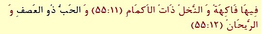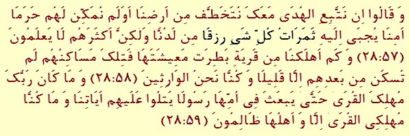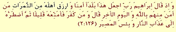 2:126 - And when Ebrahim said; my Lord, make this town secure and provide for its inhabitants all kinds of fruits for those who believe in Allah and the Last Day. He said and the one who disbelieves, then I provide for him a little, thereafter, I see no option for him but the punishment of the Fire, and a miserable abode. And then Allah answered Ebrahim's prayer: ú 28:57- 59 - And they said; if we follow the guidance with you, we will be banished from our land. Did we not establish for them a sacred secure sanctuary wherein all kinds of fruits flow and provisions from Our special place? However, most of them do not know. And many a community We annihilated, that they were unappreciative of their provisions, only a few of them left to occupy their places, and indeed We were the inheritors. ? And your Lord never annihilates a community unless He raises a messenger from them who recites Our signs to them. We never annihilate a community until its inhabitants commit injustice. 55:11-12 -Therein are fruits and date palms with hanging clusters. Also whole wheat and spices.