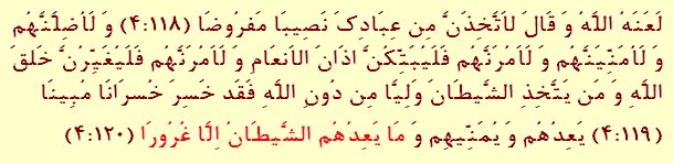 10:4 - To Him is your final destiny, all of you, Allah’s promise in the truth. Indeed He initiates the creation then repeats it in order to reward those who have believed and led a righteous life justly. As for those who have disbelieved, awaiting them is hellish drink and a painful punishment, because of their continuous disbelief. 27:64 - Who is the One who initiates then repeats it? And who is the One who provides for you from the sky and the land? Is there any other elah with Allah? Say; present your proof if you are truthful. 29:19 - Do they not see how Allah initiates creation then repeats it? Indeed this is easy for Allah. We are hypnotized by satan, let us test ourselves. If you want to buy an orange and you find a label on it that says, "This orange will give you nausea, stomach ache, dizziness, vomiting, and cause birth defect, or it may killyou, would you buy that orange? No you would NOT! But, why is it that we pick up a medicine over the counter and the label says, you may experience, nausea, stomach ache, dizziness, vomiting, and cause birth defect, and might kill you, then we even pay for it to get all these diseases, just because it says on it "Relief headaches" ?!..... Allah new satan will mislead people through pharmaceutical companies in order to Change Allah's Creations, that is why we have these verses 4:118-119 in the Quran. Allah has cursed him (statan) and, he said, I have indeed possessed a definite share of your servants. And, I will mislead them and will tempt them and command them to Mark the Ears of Animals and to Change Allah's Creation. Again whoever takes satan as an ally besides Allah then he has suffered a clear loss. 4:118 - Allah has cursed him and he says I have indeed possessed a definite share of your servants. 4:119 - And, I will mislead them and will tempt them and command them to mark the ears of animals and to change Allah’s creation. Again whoever takes satan as an ally besides Allah then he has suffered a clear loss. 4:120 - He promises them and tempts them. However, Satan does not promise them but an illusion. |