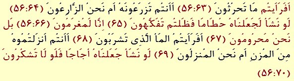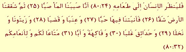 80:24- 32 -Then let the human being look at his food. Indeed, We pour the water generously. We then split the ground, with cracks. Consequently, We grow therefrom grains, and grapes and pastures,and olives and dates, and dense orchards, and fruits and vegetables. As a provision for you as well as your livestock.