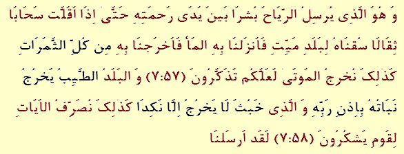 7:57 - And He is the One who sends the wind bringing the good news of His readily available Mercy. Once the heavy clouds gather, We drive them to the town that was dead, we then send down water therefrom and bring out all kinds of fruits. We thus resurrect the dead, that they may be reminded. 7:58 - As for the town that is pure, its plant germinates with its Lord’s permission. And as for the one that is impure, only less potent plants germinates. We thus explain Our proofs for the people who are grateful. If you have noticed, they have been announcing in news media, that the total amount of nutrition of plants 60 years ago, were 5 times greater than plants harvested today! Another words, you must consume 5 apples today, in order to get the same amount of nutrition of only 1 apple that you used to eat 60 years ago!....That was the time that, we decided to IMPURE Allah's creations, by spraying everything with every kind of Herbicide, Pesticide, Larvicide, Fungicide, we decided to Genetically Modify things that we do not know anything about, and..... Yet, Allah does not want us to corrupt the land.