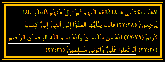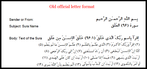 Dear "Submitters to the Covenant of ALLAH with Bani Esra Eil" "Submit to the Covenant of ALLAH with Descendents who would be Transported by ALLAH from the time of Awedam to the end of this world" Thank ALLAH for His Awesome "Hikmah" (12/10/2019) Long ago ALLAH dropped on us an awesome "Hikmah" and I just remembered it that is why I just want to remind the new comers with that "Hikmah". As you know 112 Sura in the Arabic Quran starts with "Bisme Lahe Al Rahmon Al Rahim", or basically for short "Besmellah" Now for many many years and even now so called "Muslims" translated all of those 114 repetitions of this phrase as: "In the name of ALLAH, the Gracious, the Merciful" And they have been starting to read those Suras in the Quran with this phrase. Even some illiterate ones they start talking with this phrase! Now let us look at those old official letters format: That means this sura came down: "With the name of ALLAH, the Gracious, the Merciful" Then the name of this first Sura revealed to Prophet "Mohammad" is "Al Alagh" or "Embryo". Therefore, when you read the Quran you do not want to repeat this phrase which it says, it came down "With the name of ALLAH, the Gracious, the Merciful". And in the First Verse revealed to Prophet "Mohammad" ALLAH said to him: How to start reading the Arabic Quran ALLAH says: *"Besme Rabby Al lazi Khalagh"* "Read: In the name of my Lord Who created" ALLAH is telling us that when ever we read the Arabic Quran we must start by saying this phrase in an Arabic language: "In the name of my Lord Who created" "Besme Rabby Al lazi Khalagh" As you know "Creation" is the Most Important Attribute in the system of the Almighty ALLAH becasue, without "Creation" there would be nothing Also as you know: "When you read the Quran, you shall seek refuge in ALLAH from shaytan the rejected" (16:98) Therefore, here is how to start reading any Sura from the Arabic Quran: *"Besme Rabby Al lazi Khalagh"* * Aouzo Bellah men alshaytan Rajeem* You should know that 112 of those Suras in the Arabic Quran comes from ALLAH to us. That means ALLAH is directly talking to us. Then we have Sura 9 "Ultimatum", "Bara ah". This Suran does any "Besmellah" on the top, although Sura 9 is from ALLAH but, it is NOT just from ALLAH Alone to us yet, it is an "Ultimatum" from ALLAH and His messenger, Prophet "Mohammad", that is why it starts with: "An ultimatum from ALLAH and His messenger to the idol worshipers who enter into a covenant with you" (9:1) That is why Sura 9 Does NOT have any "Besmellah" on the top. Again we do start with: *"Besme Rabby Al lazi Khalagh"* * Aouzo Bellah men alshaytan Rajeem* Then we notice another "Besmellah" in Sura 27 "Al Naml", "The Ant". That was when "Soleymon" ordered that "Hoopoe" to take a letter to Queen "Saba" and drop it on her and wait for her answer. Eventually "Soleymon" wrote on a small piece of a note and gave it to that "Hoopoe" in order to take it to "Saba" and told him make sure do not laugh or talk to anyone on the way! . . . just kidding. He wrote on a small note like this one. On the front he wrote "From Soleymon" or "Besme Soleymon" and on the other side he wrote this phrase as ALLAH was saying: "From ALLAH the Gracious the Merciful. like ALLAH said, "Do not be Exalt yourselves over ME; come to ME as Submitters.' " Queen "Saba" received that letter, which was dropped on her by that "Hoopoe" and she red it for her advisers. It said: "Indeed It is from "Soleymon", and indeed it is,`From ALLAH, the Gracious, the Merciful'." (27:30) She told her advisers that although "it is from "Soleymon" but, ALLAH says, "Do not be Exalt yourselves over ME; come to ME as Submitters.' " Again this is another prove that "Besmellah" was meant to be from ALLAH like ALLAH was talking to "Saba". You must know that "Soleymon" did not want "Saba's" land nor did he did not care about to concur "Saba's" land because, he did not need to do that. He was given the kingship of the whole world by ALLAH yet, his only concern and worries was because he wanted to direct those arrogant sun worshipping people to the Right Path of ALLAH. And at that time he was given that mission from ALLAH to be a Prophet of ALLAH for the whole world. Here is another prove: In Sura 44 "Al Doukhan", or "The Smoke" on the 19th verse Prophet "Moosaw" said to his people, "Do not Exalt yourselves over ALLAH .