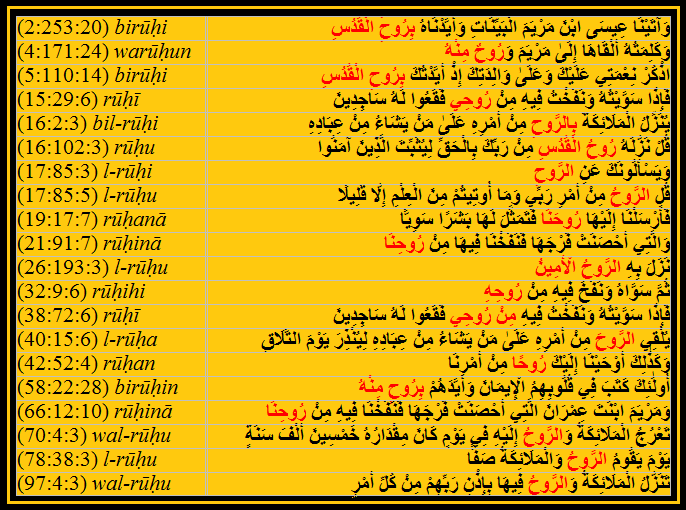 Respectively ("Ruach" in Hebrew - "Rucha" in Aramaic - "Rouh" in Arabic) as you notice they are all sound the same with a bit of accent. We do not know the numbers of ALLAH's "Rouh" in His Kingdom. In (42:52 ; 58:22 and 4:171) of the Arabic Quran) ALLAH says, Illiterate Preachers READ The Arabic Quran "and thus We have revealed to you 'A ROUH' of Our command" (42:52) * * * * * "and We helped them with 'A ROUH' from Him" (58:22) * * * * * And 'A ROUH' from HIM (4:171) As you notice in these two verses ALLAH says, "A ROUH". That means there are numbers of "ROUHs" in ALLAH's Kingdom. Remember everything belongs to ALLAH. So when He said, "I blow into it from My "ROUH" (15:29; 21:91; 32:9; 38:72) Or in (19:17) ALLAH says, "We sent to Maryam Our "ROUH". He went to her in the form of a human being Does Not mean that ALLAH has a "ROUH" inside of Him yet, "ROUH" is one of His High Ranking creature "O people of the scripture, do not exaggerate about your religion, and do not say about ALLAH except the truth. Indeed Maseah the son of Maryam, was a messenger of ALLAH, and HIS word that HE had sent to Maryam, and A "ROUH" from HIM. Therefore, you shall believe in ALLAH and His messengers. And you shall not say, "Trinity." You shall refrain from this for your own good . . ." (4:171) Then we have "ROUH Al-Ghodos" and "ROUH Al-Ameen" (2:87; 2:253; 5:110; 16:102; 26:193; . They are the ones who READ revelations to Prophets. Here are all the words has to do with "ROUH" in the Arabic Quran: Just look at these verses (19:17), (21:91), and (66:12), They all say: "We sent to her Our ROUH". Then He (The ROUH) appeared to her as a human being, perfectly formed. (19:17) That means from ALLAH and the "ROUH". But notice here, "If that was a Rouh of ALLAH, the soul inside of ALLAH's body that means ALLAH turned to a HUMAN BEING! . . . You see how stupid it would be. . . They were from Two Separate Entities Then those illiterate religious leaders told people that "ROUH" means that, ALLAH has an 'entity' or a 'being' or a 'soul' inside of His 'body' called, "ROUH" like humans having a physical body and a soul inside their body. That was how they have been messing up people's mind all of these years and no one takes heed because, they have been following from those illiterate preachers blindly. Now look at verse (17:85) it says, "They ask you about the "ROUH". Say, "The "ROUH" is at my Lord's Command. The knowledge given to you is minute." As you notice ALLAH Does Not say "MY ROUH" meaning that ALLAH has a "ROUH" in His body Then few years back those wicked translators called that "ROUH" as "SPIRIT" Because, the word "SPIRIT" comes from the Latin word for "Breath" and like Breath, Spirit is considered a fundamental part of being alive. As the "Enjeel" says, "The Breathing Soul". And that is when the "ROUH" blows into our body. That was how they entered this word of "SPIRIT" into our daily dictionary in order to mislead the whole world and commit a horrendous crime against the Almighty Creator. Therefore, they made up a fake creator with a 'body' and 'soul'. First of all "ALLAH Creates and Chooses, it is not for us to chose" (28:68). The reason they committed this crime was because the Almighty mentioned in several verses of His scriptures that, "At the time of Birth, ALLAH chooses a "Nafss" or a "Soul" from the other side and He orders the "ROUH" (one of His High Ranking creature), Blows that Soul into that new born baby on earth". ALLAH calls our "Soul" as "Nafss", meaning "Soul" in Arabic language or "Na Fass" from the same root word meaning "Breath" and in those other old languages means, "Wind", and "Breath" with a bit of accent, Torah, Ezekiel (36:27). All of those people in the Middle East believe that they have a "ROUH" inside of their body. Yet, ALLAH says that we have a "Nafss" inside of our body. You see how misled they are? It is all because they Do Not want to READ the Quran yet, they complain that why they are suffering from unhappiness! . . . That is why they are suffering from illiteracy. And that was the same "Nafss" or "Breath" which was blown into our body by "Al-ROUH". And then those illiterate misleading religious leaders committed another crime and said to the people that, "We humans have the Almighty's "Soul" inside of us" In a way they are saying that, The Almighty Creator has all of those ugly human traits and behaviors inside of Him like; Being Resentful, Rudeness, Foolishness, Selfishness, Carelessness, Being an Idol worshiper, Being a Disbeliever, Arrogant, wicked, Murderer, Thieves, Being Greedy, and all the other ugly traits of humans. Can you believe that? These are all crimes against ALLAH That is why followers of these fake and false religions are suffering right and left with different kinds of disasters all over the world Do Not let these illiterate preachers and religious leaders and translators Rape your Heart and Soul and mislead you in order to take away your money so they could purchase more mansions and airplanes. Do Not let these charlatans fool you. Hey Religious Leaders look at these verses: If you are able to READ The Arabic Quran you would see that these verses say, "HIS Angels" Just like "HIS ROUH" Get out of those places and ask the Almighty Creator to Teach you His scripture since ALLAH is the Only Teacher of His scriptures and He is the knower of all things. Make sure take out the word "SPIRIT" out of those scriptures and dictionaries and replace it with the correct word of "ROUH" That is why ALLAH commanded you to use your brain and learn His Arabic Quran otherwise, you will be evicted from this world as an illiterate and a blind person. Illiteracy brings blindness. DO not let those illiterate translators and mullahs invite you to the Hell Fire. Remember please, "We Do Not Believe In god Or Any Of Those Made Up Names Yet, We Only Believe In ALLAH" *You want to live a life in a different key, otherwise you are just wasting your time* *We are the only "ALLAH's Activist"