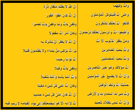 Then there is Sura 1 "Al Fatehah", "The Key" which "Besmellah" is the first verse of this Sura, and it is Not on the top of this Sura either. As you remember the words of this Sura was given to "Awedam" and his "Wife" in order for them to be redeemed since they have got fooled by sheytan in the Heaven when they ate from that forbidden tree. So, when we recite Sura 1 "Al Fatehah" that means we are talking to ALLAH directly because this is the only Suran that we talk TO ALLAH, and asking Him to forgive us and guide us to His right path, when we perform our 5 daily "Contact Prayers", "Salat". Therefore, in this Sura "Besmellah" means: "In the name of ALLAH, the Gracious, the Merciful" Or I start, "with the name of ALLAH, the Gracious, the Merciful" Therefroe, the repetitions of this phrase becomes a total of 114 times in the whole Arabic Quran which is divisible by the number "19" the base for the Mathematical Miracle of the Arabic Quran. Remember please, "We Do Not Believe In god Or Any Of Those Made Up Names Yet, We Only Believe In ALLAH" *We are the only "ALLAH's Activist" in the world* Thank ALLAH for guiding us to His right path and His Only One Religion. Thank ALLAH for blessing us with all of these "Knowledge" and "Hikmah" |