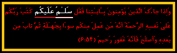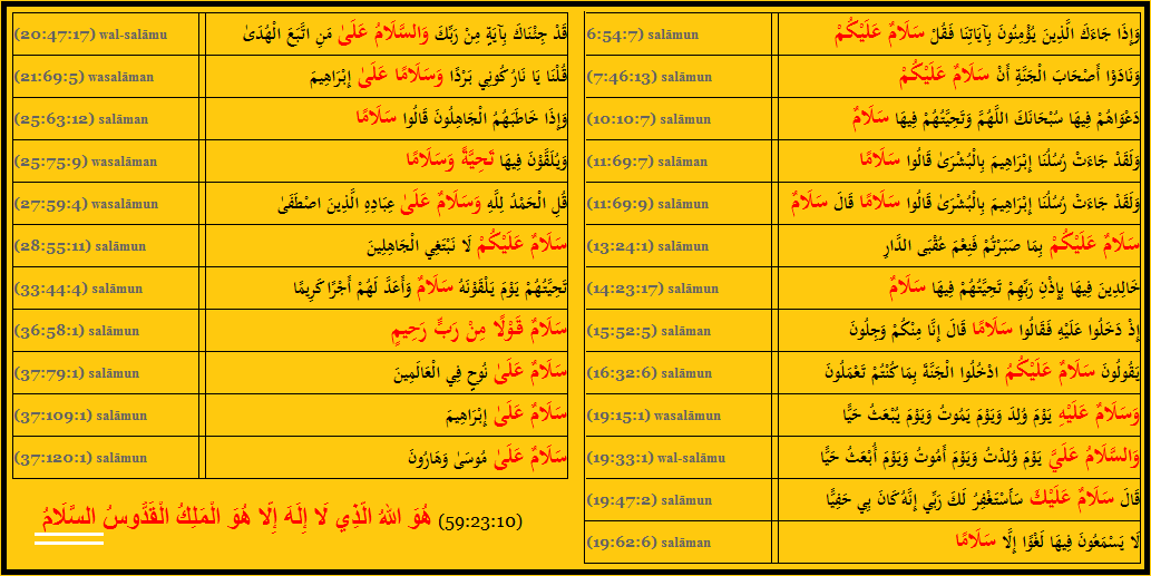 Arabic language when you talk with one person, singular, you say, Here are verses from the Arabic Quran with the word "Salaam" or "Peace" : As you know one of the Most Beautiful Names of ALLAh is "Al-Salaam","Peace". (59:23) Remember ALLAH also says, ". . . When you enter any home, you shall greet each other a greeting from ALLAH that is blessed and pure. ALLAH thus explains the revelations for you, that you may understand." (24:61) Remember when insha ALLAH we enter the Heaven we will be greeted with "Salãmun `Alaykum" or "Peace be upon you" by the Angels. Remember please, "We Do Not Believe In god Or Any Of Those Made Up Names Yet, We Only Believe In ALLAH" *You want to live a life in a different key, otherwise you are just wasting your time* *We are the only "ALLAH's Activist" in the world* Thank ALLAH for guiding us to His right path and His Only One Religion. Thank ALLAH for blessing us with all of these "Knowledge" and "Hikmah" |