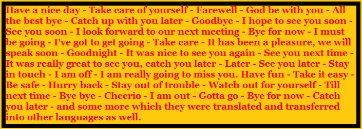 Arabic language when you talk with one person, singular, you say, Now we are going to talk about what to say when you depart from people or when you leave your friends after a visit. Here are some of those phrases that people use these days in north America: Some of these are really ridicules like "Take care of yourself"! . . . or "Watch out for yourself"! . . . Yet, they might get hit by a car just a few minutes after or get some kind of virus. Then how can you protect yourself? ALLAH is the One Who is taking care of us and He is the One Who is in control of all things in the whole seven universes. I mean how can you have a nice day? This is just wishful thinking, we are not in control of anything. Or "Goodnight" and "Good evening". These slangs are mostly for people who do not believe in ALLAH. The original goodbye, dating from the 1570s, was "godbwye", which was a contraction of the farewell phrase "God be with ye!". Now this one was much much better than those others. This shows that we used to be closer to ALLAH in those old times. That is why these days we are facing with so many different disasters and problems in our society. Remember those days women were not working, we did not have homosexuality any many other problems did not exist at that time. Today everything we do is against ALLAH's system. Again