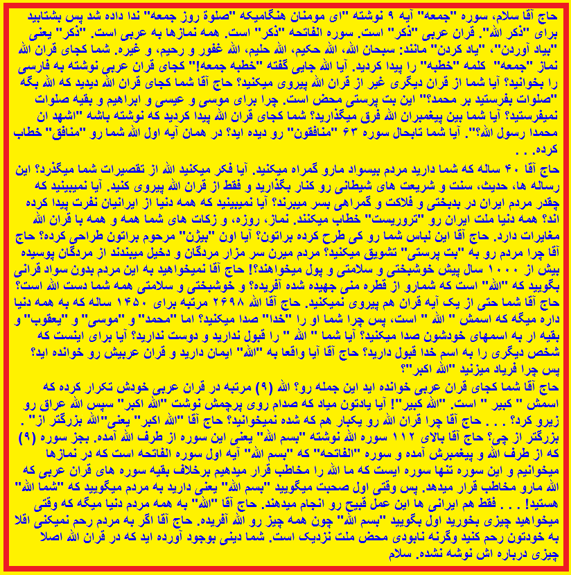 under "Saint" I had to place this post in Farsi language. It is mostly about hypocrisy of witnessing that Prophet Mohammad is the messenger of ALLAH, follwing from ALLAH's Arabic Quran instead of those resalah, hadith, sunna and sharia laws. Or those made up outfits and how their "Salat, Zakat and Fasting" are wrong or "ALLAH Kabeer", and those shaytanic shrines and why they do not follow from the Arabic Quran alone. Remember please, "We Do Not Believe In god Or Any Of Those Made Up Names Yet, We Only Believe In ALLAH" *We are the only "ALLAH's Activist" in the world* Thank ALLAH for guiding us to His right path and His Only One Religion. Thank ALLAH for blessing us with all of these "Knowledge" and "Hikmah" |